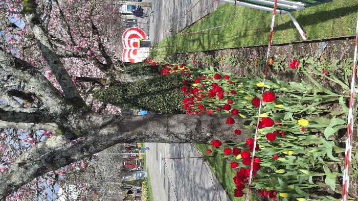 The image displays an outdoor urban park environment, identified as the Jardim da Avenida da Liberdade in Barcelos, Portugal. The foreground features a linear flowerbed containing numerous flowering tulips, predominantly red with intermittent yellow specimens, accompanied by green foliage and unopened buds. This flowerbed is bordered by a red and white striped barrier tape, indicating a restricted access area. Directly behind the flowerbed, two mature deciduous trees with grey, lichen-covered bark rise from the ground. These trees are in bloom, displaying abundant pink blossoms. Between these trees, tall, conical evergreen shrubs are planted. To the left of the trees, a paved pedestrian pathway runs parallel, where several individuals are present in the midground and background. One person in a blue shirt is partially visible on the path in the midground. Further back, another figure in blue attire is seen on the pathway. On the far right in the background, a person in dark clothing walks away from the camera. A distinctive large red and white striped heart-shaped sculpture, known as the Coração de Barcelos (Heart of Barcelos), is prominently situated on the right side of the background. Beyond the immediate park elements, distant urban structures are vaguely discernible under a partly cloudy blue sky. The scene is illuminated by bright daylight, casting shadows.
