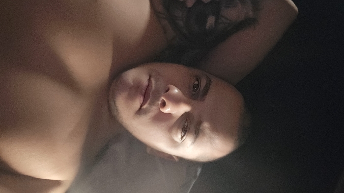 The image displays a close-up of a male subject in an indoor setting. The subject is positioned in a semi-reclined posture, appearing shirtless with the upper chest and shoulders exposed. He possesses short dark hair, light stubble on his chin and jawline, and light-colored eyes. His gaze is directed towards the camera, with the right eye appearing slightly narrowed. The subject's head rests against a light-colored surface, possibly a pillow, visible behind his right shoulder. A portion of what appears to be his left arm and shoulder, exhibiting a dark tattoo, is visible in the upper left section of the frame. The background is uniformly dark and indistinct, suggesting low light conditions. No discernible features within the image indicate a specific location within the city of Pleven, Bulgaria.