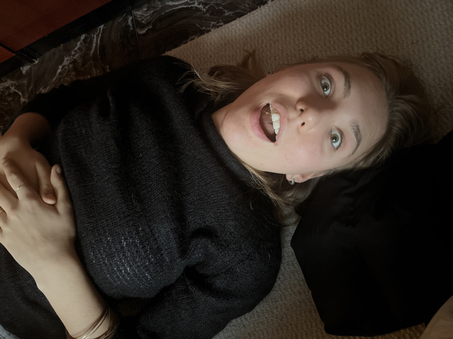 A young Caucasian female is depicted lying on her back, oriented with her head towards the bottom of the frame, eyes open and mouth agape, revealing a tongue piercing