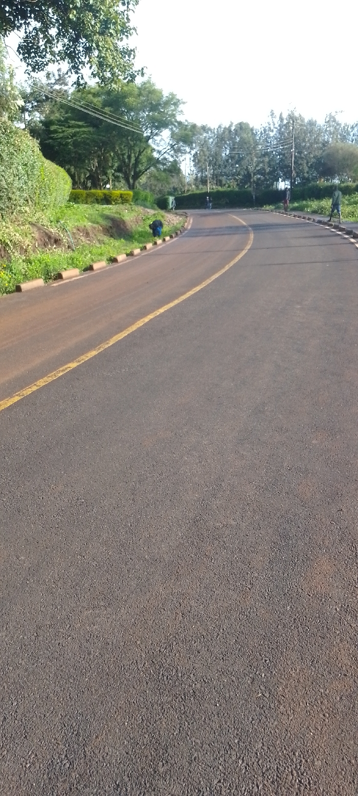 An asphalt road with a solid yellow dividing line extends into the distance, curving right. The road surface is dark grey, with areas of reddish-brown dirt adhering to it. On the left, a raised dirt embankment with green vegetation and small, light-brown concrete curb segments runs alongside the road. A person wearing a blue garment is bent over at the base of this embankment. Further along the left side, a dark green utility box is visible near the road edge. On the right, similar curb segments border a dirt and grass verge, beyond which stands a line of trees. Several individuals are present in the distance on the right side of the road; two are standing or walking on the verge, and one is further back, possibly walking or cycling on the road. Overhead utility lines span across the scene, supported by poles on the right. Lush green trees and bushes dominate the background, particularly on the left, under a bright, clear sky. The scene is located in Ngong ward, Kenya.
