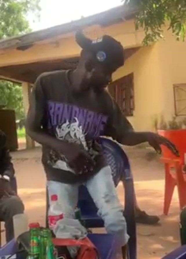 A man in a black t-shirt, ripped jeans, and a black baseball cap is standing on a blue plastic chair and dancing. He is facing the camera with his body turned to the right. He moves his arms and hips while dancing to music. There are several people sitting around tables in the background. There are glass beer bottles and soda bottles on the table, along with a red purse. The scene is outdoors on a dirt surface, near a building with orange brick and a white overhang. The sky is sunny, with light shining through the leaves of a tree.