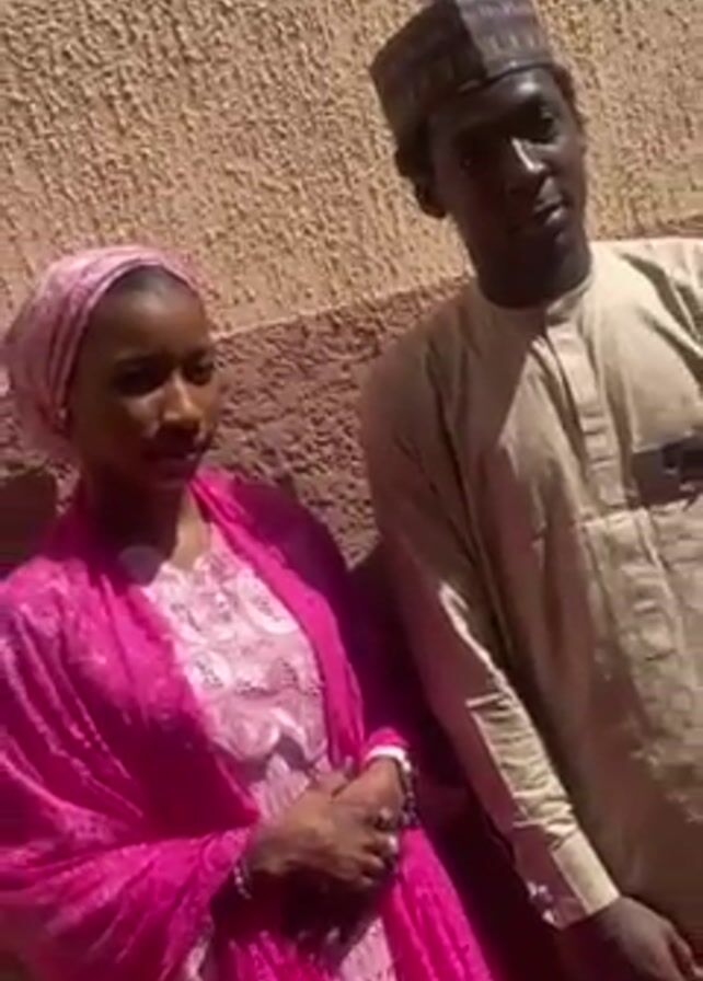 A young man and woman stand next to each other against an exterior wall. The woman is on the left and wears a pink headscarf and long pink dress with white details. The man is on the right and wears a tan cap and a long tan robe with embroidery. The wall behind them is a light tan color. The video tilts from left to right to capture the full view of the two people.