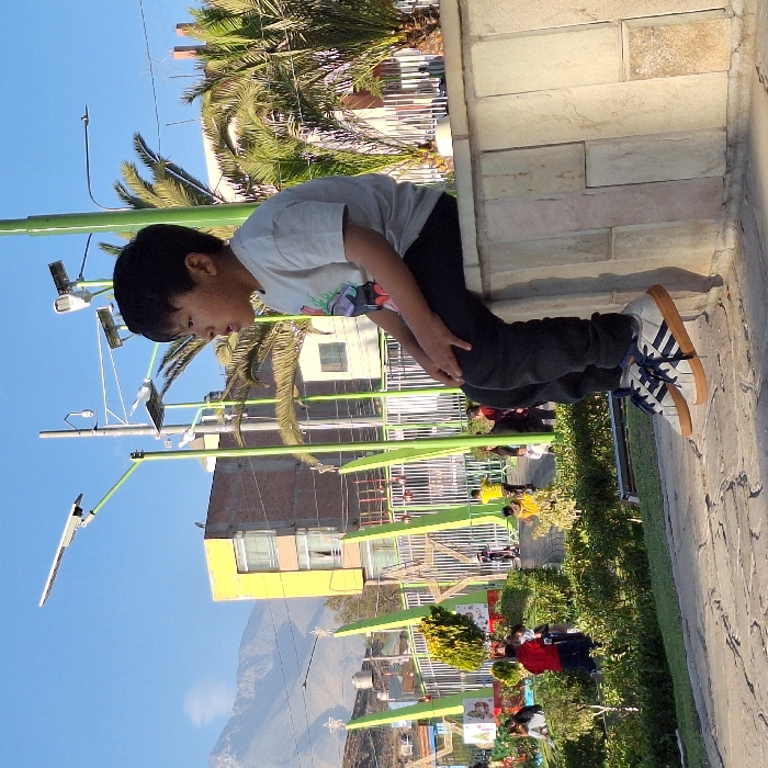 A child wearing a light gray t-shirt, dark pants, and white sneakers with blue stripes leans over a stone wall, peering downwards. Behind the child is a landscape featuring green playground equipment, people, trees, and buildings. A mountain is visible in the distance under a blue sky with a palm tree. The image is rotated, making the child appear to be sideways.