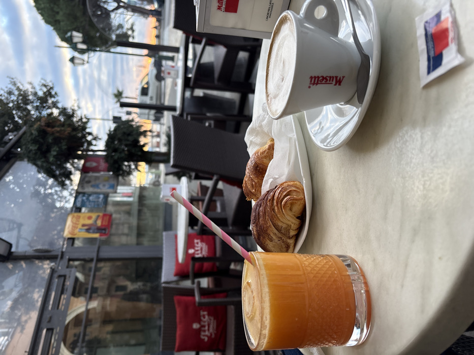 A table displays a delightful breakfast scene. A cup of cappuccino sits elegantly on a saucer with a spoon, alongside a small package of sugar. A delicate white dish holds two golden croissants. In the foreground, a glass of orange juice with a pink-striped straw completes the meal. The table overlooks an outdoor setting featuring trees, streetlights, and building facades. The view suggests a relaxed cafe ambiance.