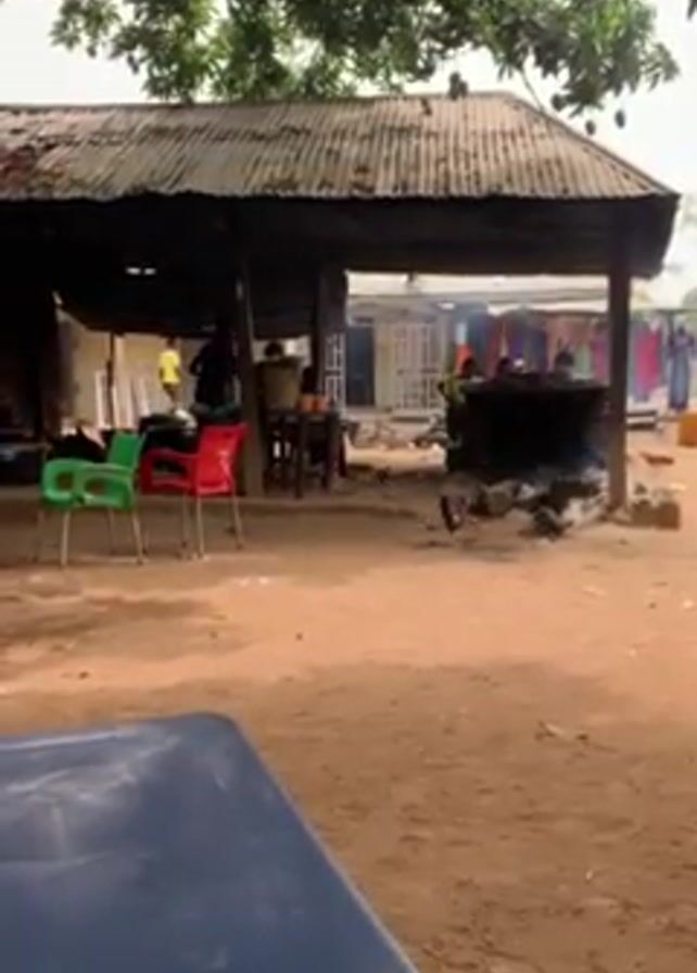 n outdoor scene that appears to be a roadside eatery or informal restaurant. In the foreground is a blue table with a stainless steel bowl. Moving towards the background, there's an area with a dirt floor, several colorful plastic chairs (green, red, and blue) arranged around blue tables. Under a corrugated iron roof structure, a person is seen standing near a cooking area with visible smoke, suggesting food preparation is happening. There are other people present in the scene. A large tree with thick roots is visible to the left of the frame. The overall environment seems somewhat rural.