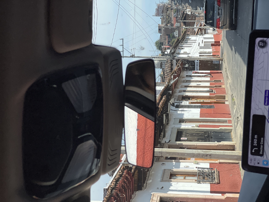 From inside a vehicle, the view shows a narrow street lined with buildings, many with red and white facades. A side mirror reflects a similar building. Above the street, power lines crisscross the sky. A navigation device displays a map indicating "Doctor Coss" is 240 meters ahead. A dark vehicle is partially visible ahead, suggesting traffic on the street.
