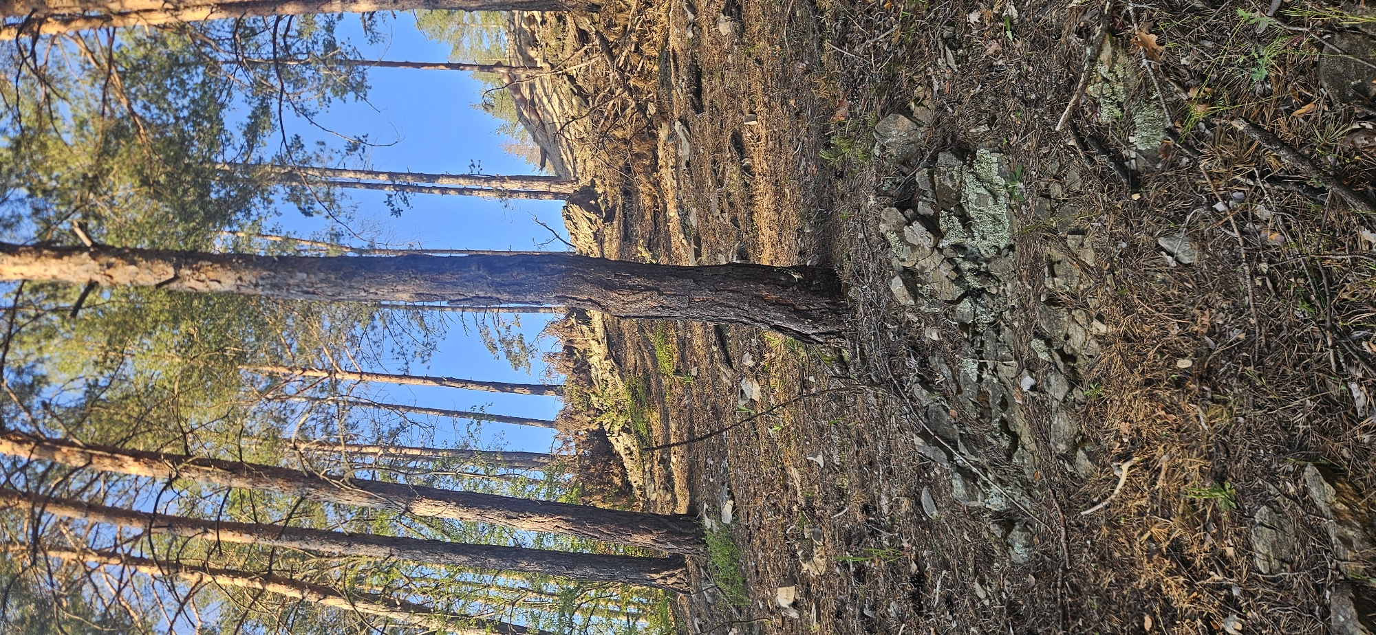 The image depicts a forested area in Kostenets, Bulgaria. The scene shows tall, thin trees with brown trunks and green foliage reaching towards a clear blue sky. The ground is covered in a mix of dry brown leaves, pine needles, and rocks. A rocky cliff or embankment is visible on the right side of the frame. No people or animals are present in the image.