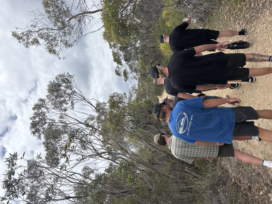Five men are walking on a dirt path surrounded by trees. They are all wearing casual clothing, including shorts and t-shirts. The man in the front is wearing a blue t-shirt with a Quiksilver logo. The man behind him is wearing a plaid shirt. The others are wearing black shirts. Some are wearing baseball caps. The sky is cloudy.