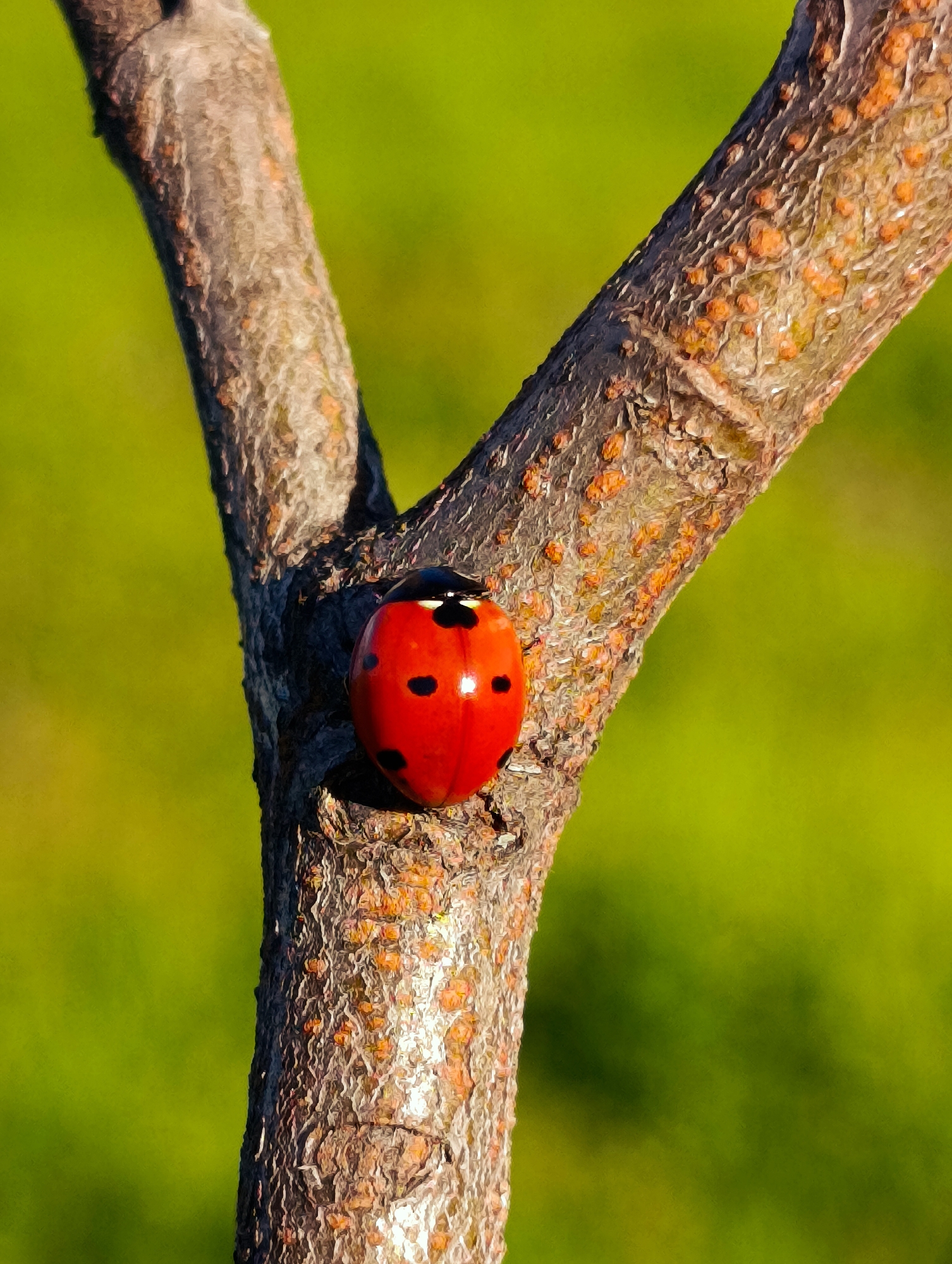 - "A close-up photograph shows a bright red ladybug with black spots perched on a small, forked tree branch" by FM-OgnH32, licensed under CC BY 4.0