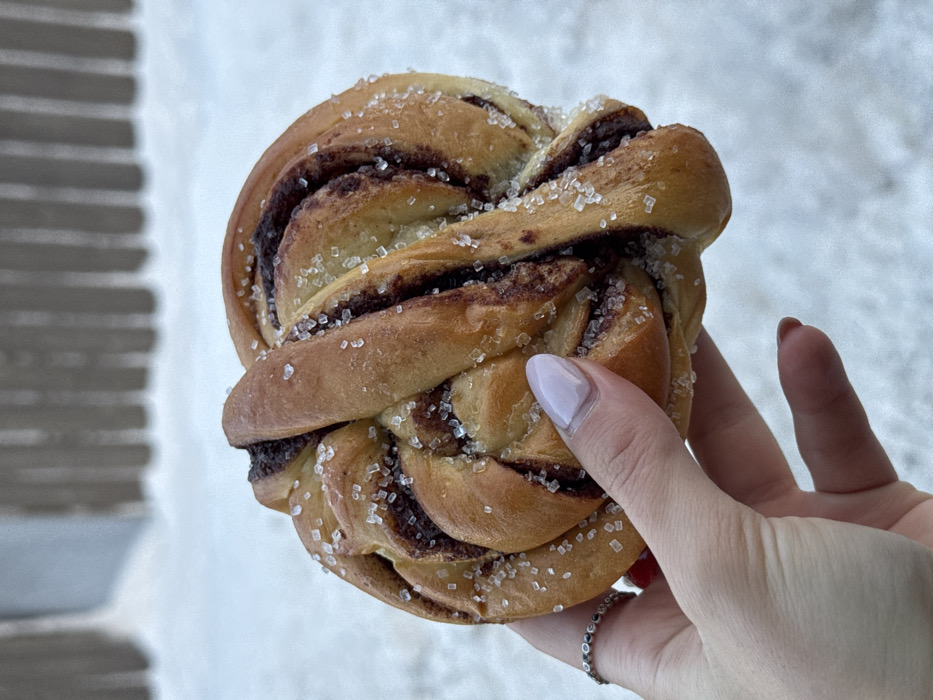 - "A forensic description of the image shows a hand holding a twisted bun with a dark filling, topped with large sugar crystals, against a snowy outdoor backdrop in Tromsø, Norway" by FM-QhCsg2, licensed under CC BY 4.0