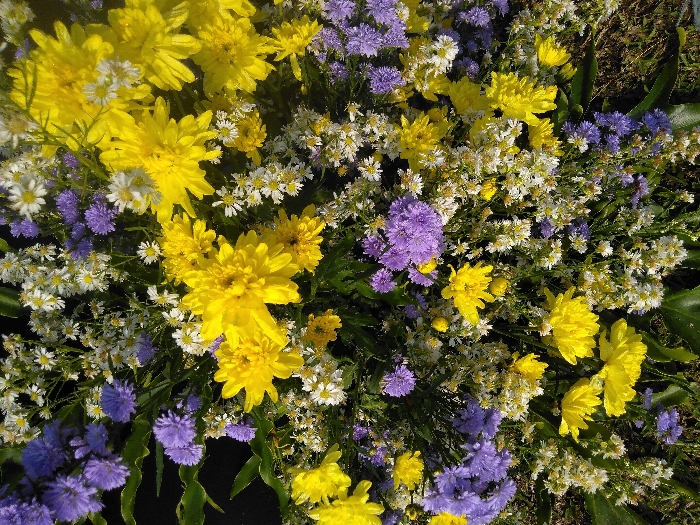 A close-up, high-angle view captures a dense floral arrangement, located in Potočná, Czechia. The scene is dominated by a vibrant mix of flowers, primarily featuring numerous bright yellow chrysanthemums, interspersed with clusters of smaller purple-violet asters and scattered white daisy-like blooms, many with yellow centers. Dark green foliage is visible beneath and among the blossoms, providing contrast. The flowers appear fresh, and the natural lighting creates subtle shadows and highlights across the petals. No other subjects, objects, or actions are visible beyond the floral display.