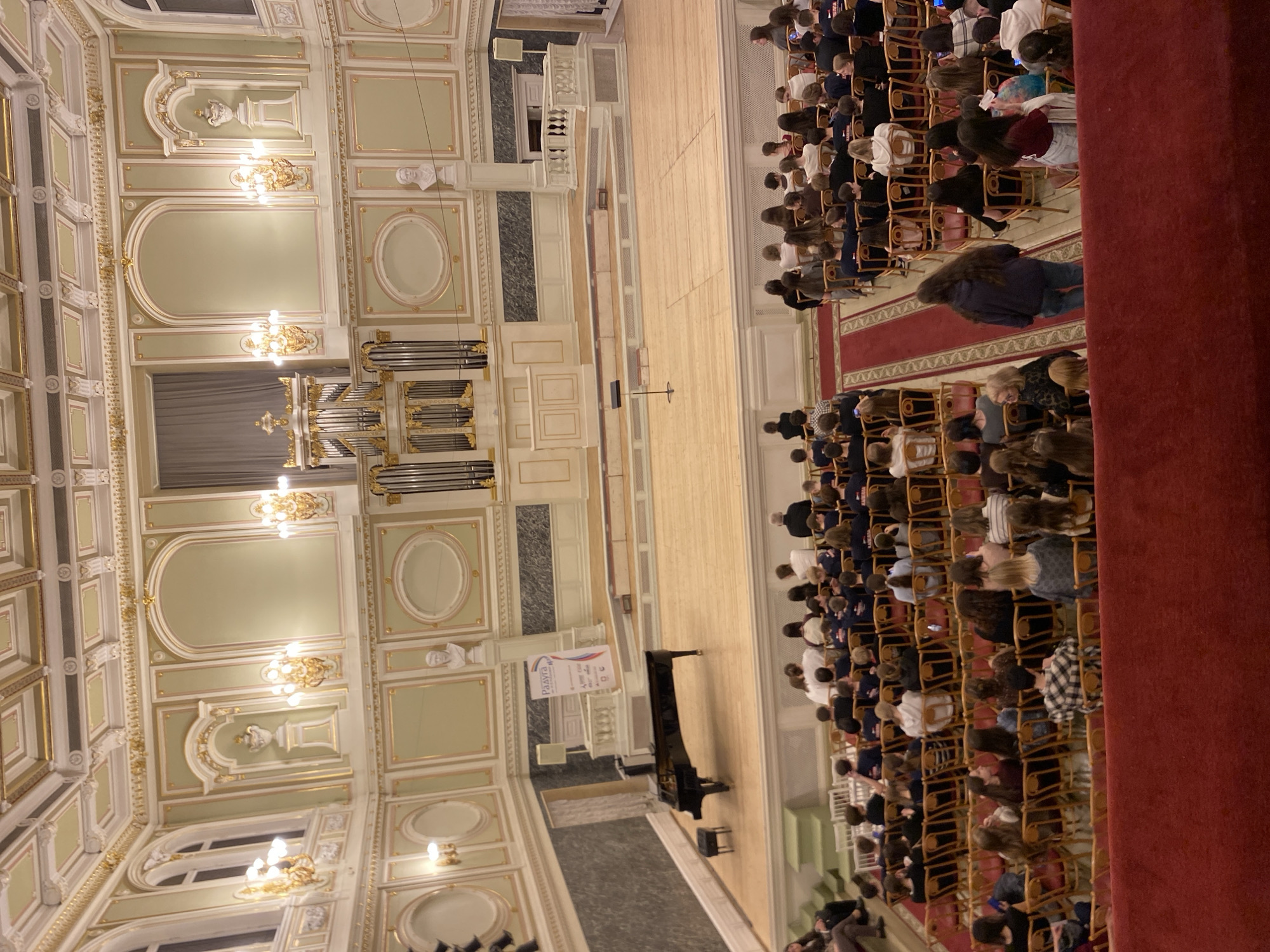 The image depicts an auditorium in Saint Petersburg, Russia, filled with an audience seated in rows of chairs. The interior architecture is ornate, with decorative molding, chandeliers, and an organ. A stage is present, with a piano and a podium. A sign in Russian is also visible on the stage. The audience appears to be observing a performance or presentation.