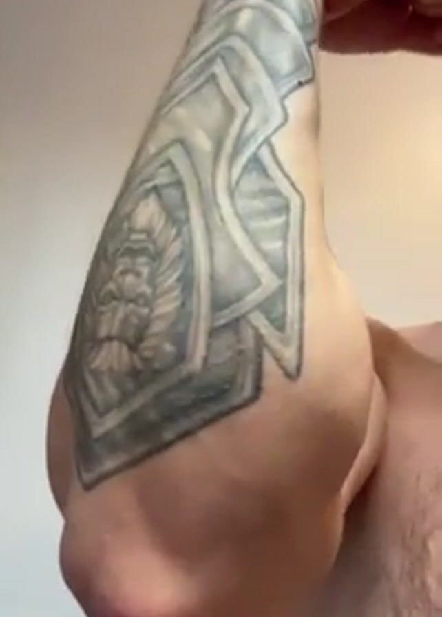 close-up of a person's arm with a tattoo. The tattoo, which is gray, is located on the person's upper arm above the elbow. The tattoo appears to depict a heraldic lion head within a diamond shield. The person is shirtless. The background is a plain, neutral-colored wall. The camera is close to the arm, focusing on the tattoo. The video is stable, with no camera movement.