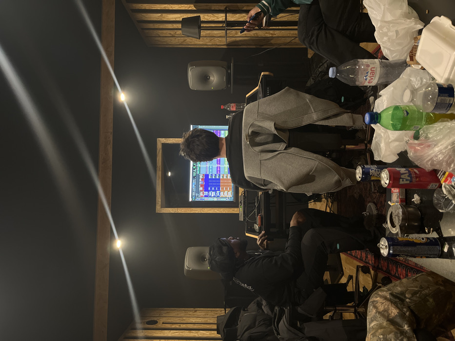 A recording studio shows two men working at a computer. One man, in gray sweatpants, sits at the desk in front of the screen. The other man, in a black jacket, sits to his left. Two studio monitors are visible. The studio has dark walls and a wooden ceiling, illuminated by bright track lighting. The floor is cluttered with empty water bottles, soda cans, and food containers.