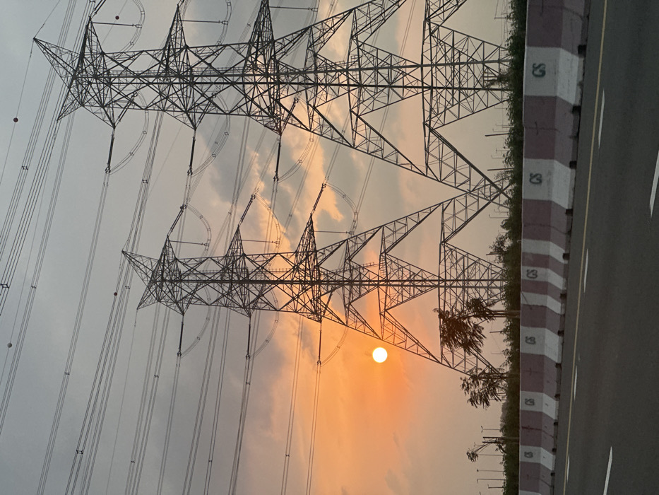 The image depicts a roadside scene at either sunrise or sunset in Al Layyan, United Arab Emirates. The sky transitions from a bright orange near the horizon on the left, where a distinct circular sun is visible, to a lighter grey-blue overhead, with scattered clouds. Two large, galvanized lattice-steel electricity transmission towers, or pylons, are centrally prominent and silhouetted against the sky. Numerous power lines extend horizontally across the frame, connected to the towers via insulators. Several spherical aircraft warning markers, alternating white and red, are attached to some of the overhead lines. In the foreground, a dark asphalt roadway with white lane markings (a solid line and a dashed line) occupies the bottom. Immediately adjacent to the road is a continuous concrete road barrier, painted in alternating rectangular sections of maroon and white. The letters "GS" are stenciled in black on several of the white sections of this barrier. Behind the barrier, a strip of low-level green vegetation, including bushes and small trees, is visible. In the distant background, several streetlights or utility poles are discernible under the overcast sky. No individuals, vehicles, or animals are present in the frame.