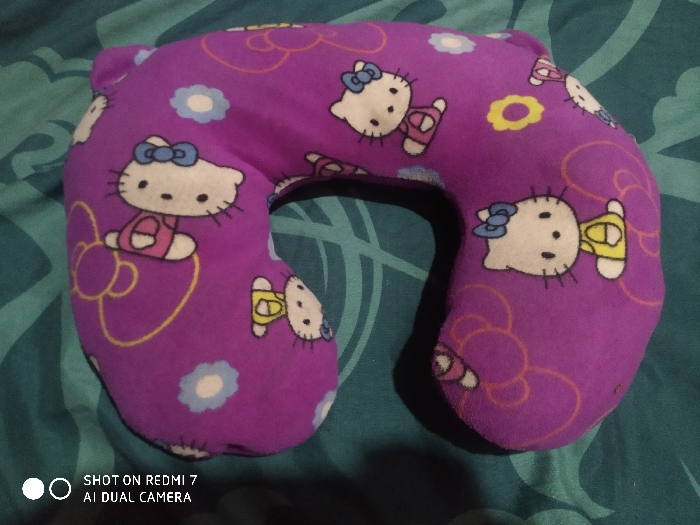 - "A U-shaped neck pillow, made of purple fabric and patterned with multiple depictions of Hello Kitty characters and abstract floral shapes (yellow and blue), is centrally positioned on a teal-colored fabric surface that features a darker, undulating pattern" by FM-kh49F3, licensed under CC BY 4.0