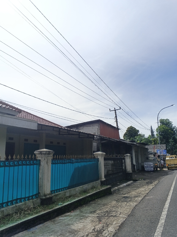 A low angle shot captures houses behind a blue and black fence. Numerous power lines stretch across the sky. A utility pole stands above the houses. A street runs alongside the fence, with vehicles parked further down. A street light is on the right side of the image, along with trees. The sky is partly cloudy.