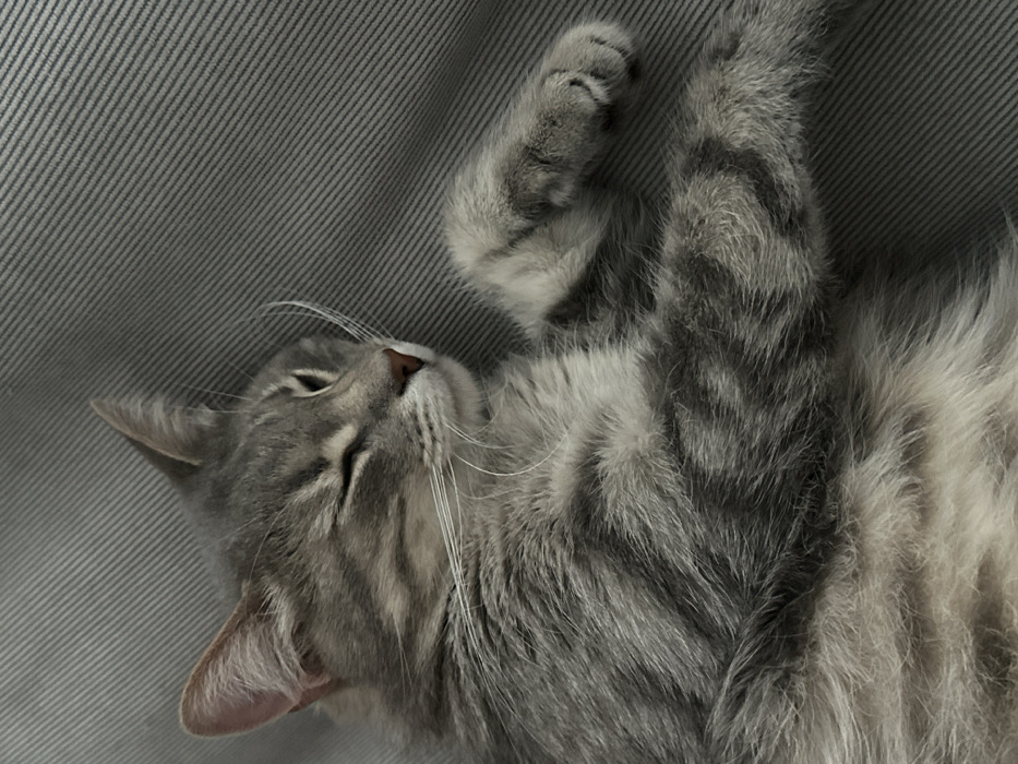 - "A medium-sized gray tabby cat is resting on its left side, facing toward the right of the frame, with its body extending diagonally downwards" by FM-3OYS02, licensed under CC BY 4.0