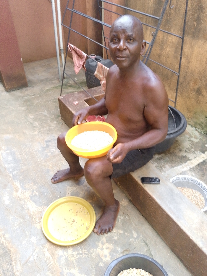 A shirtless, bald man sits on a concrete bench, holding a bowl of white grains in his lap. A matching yellow plate with scattered grains sits on the ground near his bare feet. A black mobile phone rests on the bench beside him. Additional bowls, some containing grains, are visible on the ground. A laundry rack stands in the background, with a towel draped over it. The surroundings feature a concrete patio and a building exterior.