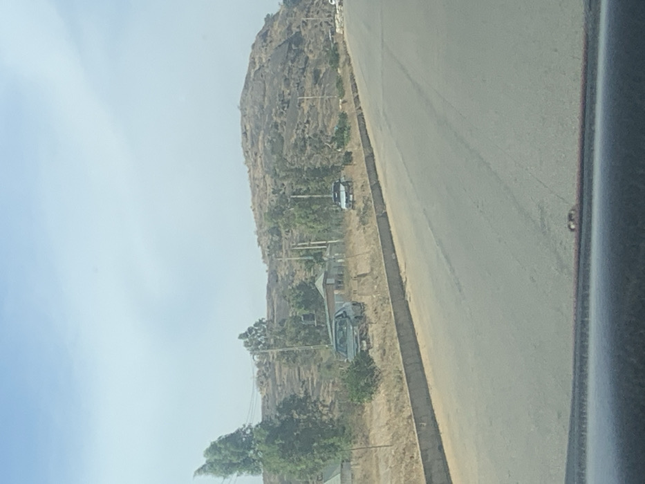 A landscape image shows a rocky hill beside a paved road. The road is gray and takes up a large portion of the right side of the frame. On the other side of the road is a steep, rocky hill with sparse vegetation. Several buildings and vehicles are situated at the base of the hill along the roadside. Power lines stretch across the scene. The sky is pale and clear. The photo is taken from inside a vehicle, with a portion of the car visible on the right edge.