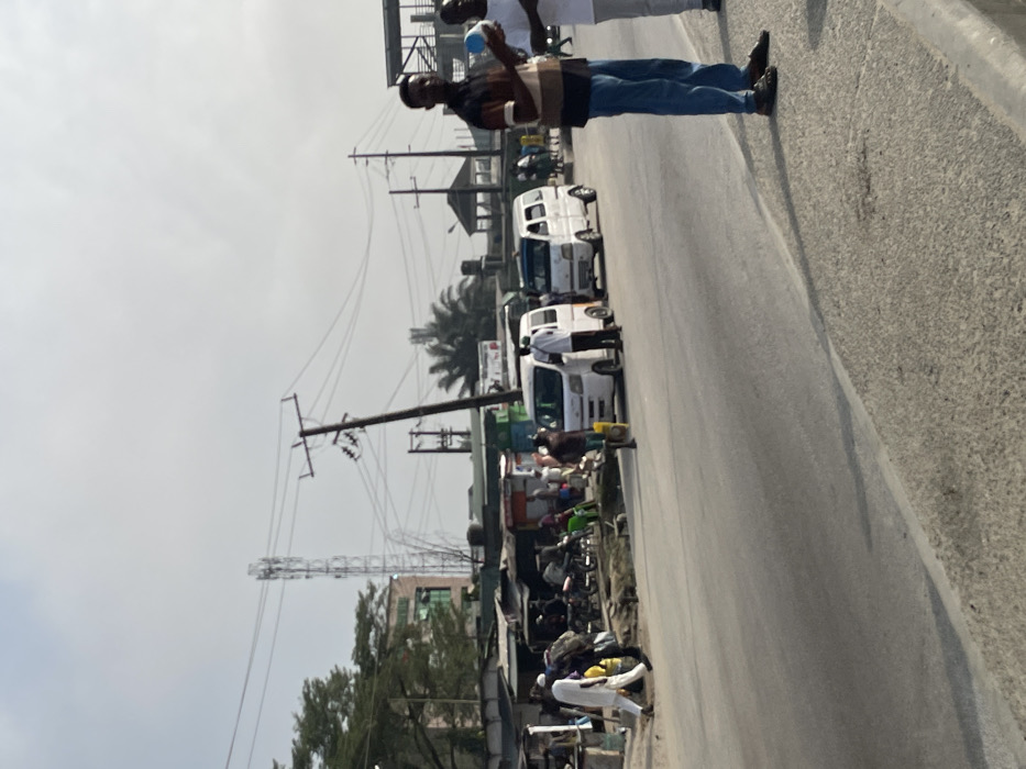 A bustling street scene unfolds with a row of white vans parked along the roadside. Several people are visible, including two men near the vans and another walking along the pavement with a blue water bottle. Adjacent to the road is a lively commercial area with stalls and various vehicles. Overhead, a network of power lines and a communications tower are present, contributing to the urban landscape under a partly cloudy sky.