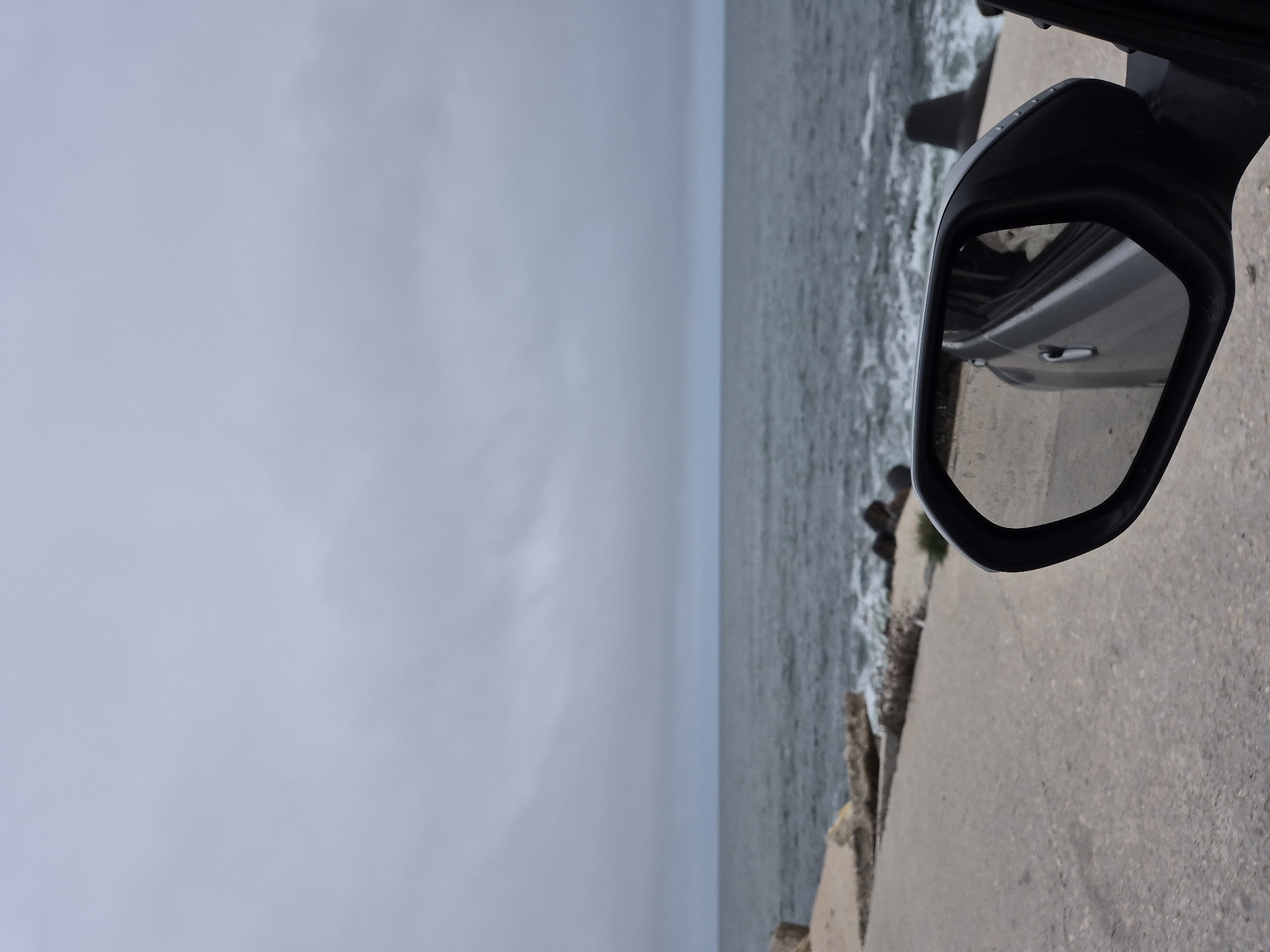 view from inside a car, likely in Varna, Bulgaria, near the coast. The left side of the image is dominated by a gray, overcast sky. The right side includes a portion of the Black Sea with visible waves, a concrete embankment or road, and the side mirror of the car. The side mirror reflects the car's door and a glimpse of the interior. The sea is partially obscured by concrete structures and low-lying vegetation. The image suggests a coastal drive along the Black Sea.