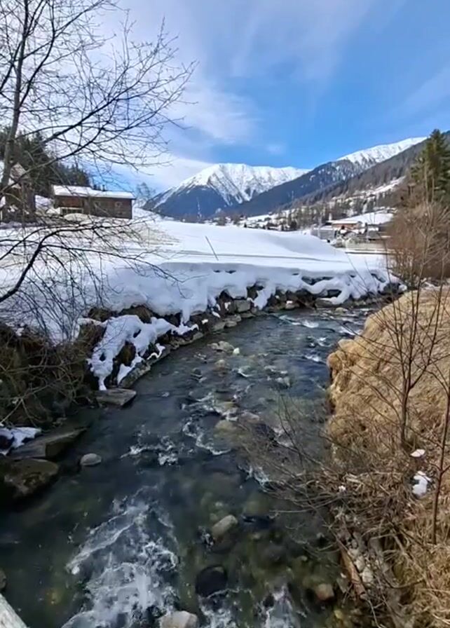 A clear, shallow river flows swiftly over rocks, its banks lined with patches of snow. Beyond the snow-covered fields, a small village nestles at the foot of snow-capped mountains under a bright blue sky with scattered clouds. Leafless trees stand on either side of the riverbank.