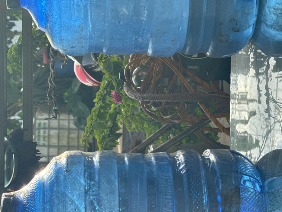 The scene is set outdoors in Ko H'Neh, Vietnam, observed through a reflective surface from a slightly elevated perspective. In the immediate foreground, two large, clear blue plastic water bottles, exhibiting condensation, flank the central view, resting on a wet or reflective surface that shows distorted reflections of the background. Between these bottles, a densely packed outdoor environment is visible. A prominent mass of vibrant green foliage occupies the midground, featuring a single fuchsia-colored flower towards its center. Partially obscured by the foliage, a coiled orange hose is visible, along with metallic components of what appears to be machinery, possibly a water pump or pressure washer. Behind these elements, a red motorcycle helmet rests on a dark, indistinct object, likely a motorcycle. Further back and to the left, a large white plastic storage tank is partially visible. Above the foliage and machinery, a horizontal metal bar structure is present, and a twisted, gnarled branch extends into the frame. The overall lighting suggests daylight. No people are directly visible, but a faint, distorted human-like silhouette is reflected on the surface below the left water bottle.