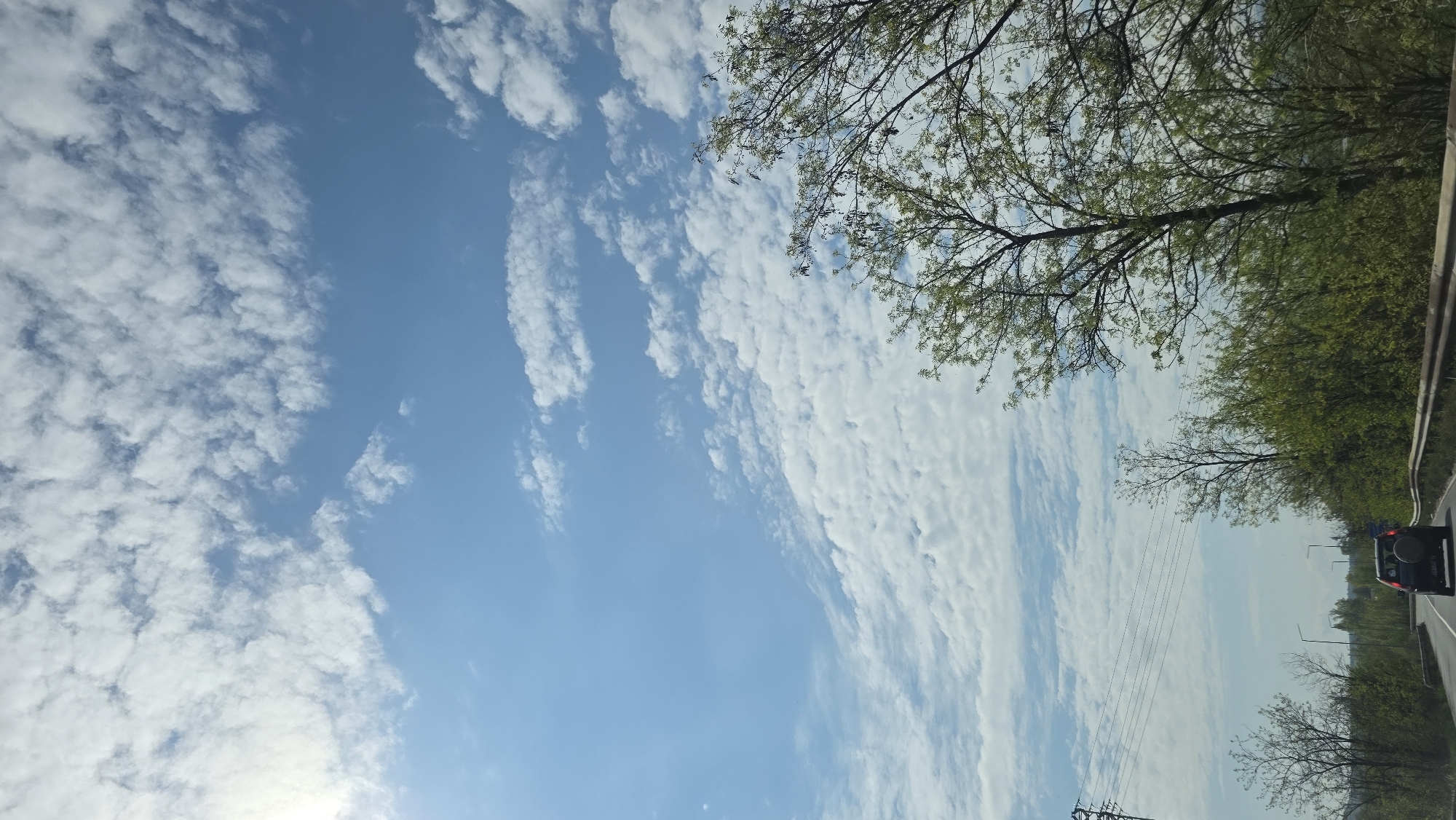 The image depicts a road in Kresna, Bulgaria, with a car driving on the right side. Above the road, there are trees with emerging green leaves. The sky is blue with patchy white clouds. Power lines are visible on the left side of the image. The image is oriented vertically.