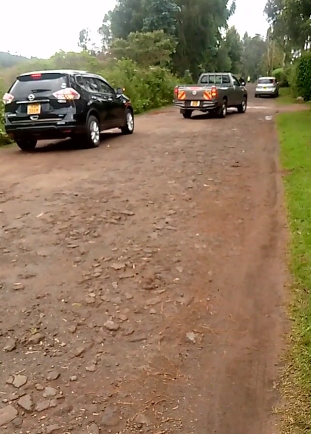 A medium shot shows a muddy dirt road with three parked cars, viewed from a slightly elevated position
