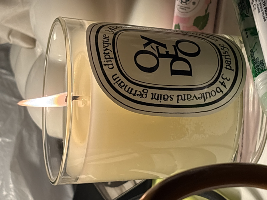 A lit Diptyque candle sits among other items, including a roll-on perfume by the same brand