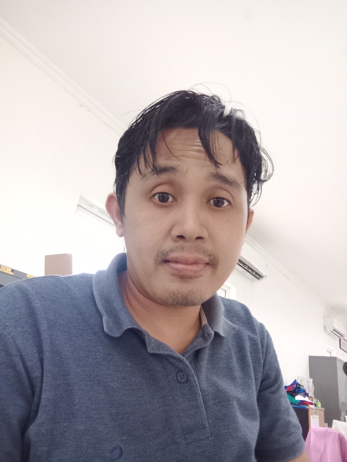 A man with dark hair and a trimmed mustache poses indoors. He is wearing a navy blue collared shirt. The background features a white wall, a small window, and an air conditioning unit. A desk with various items is visible to the right of the frame.