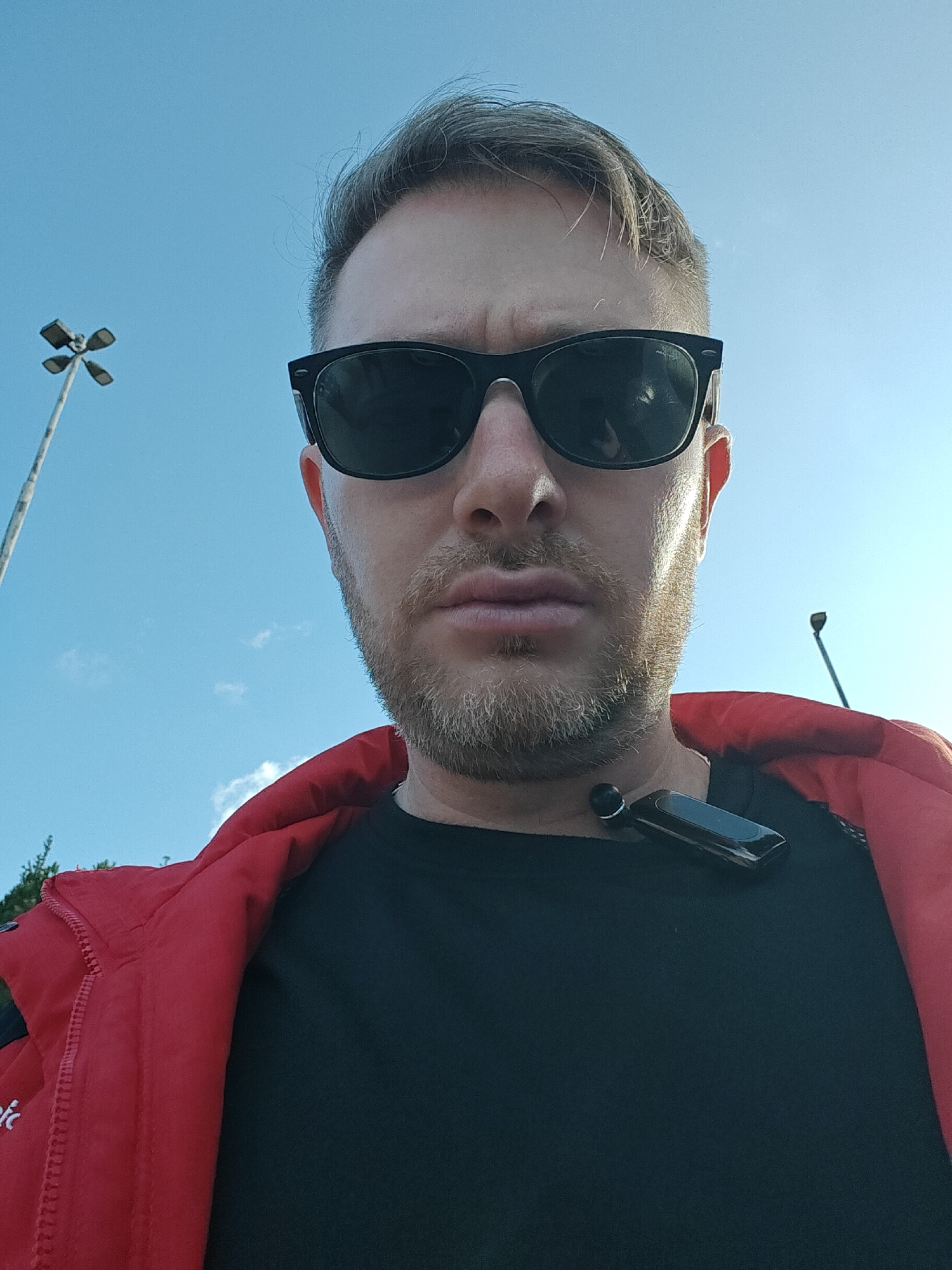 A male individual is depicted in a close-up, low-angle selfie, outdoors in Nesher, Israel. The subject has light-colored hair and a beard, and is wearing black sunglasses, a black t-shirt, and a red jacket. A black, rectangular wearable device with a round component is situated on his neck, partially obscured by his right ear. His lips are slightly pursed. The background reveals a clear blue sky with minimal, wispy white clouds. Two streetlights are partially visible: one multi-headed fixture on the far left, and a single-headed fixture on the far right. Slight green foliage is present in the lower-left corner.