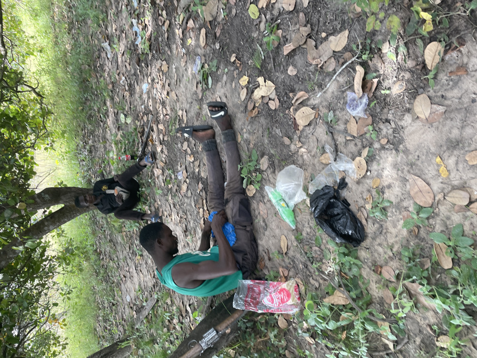 Two men sit on the ground beneath trees, amidst scattered leaves and trash. One man wears a green tank top and dark pants, holding a blue object. Beside him are plastic bags and a package. The other man, wearing a black shirt, leans against a tree with a bottle and a firearm nearby. The ground is littered with debris.
