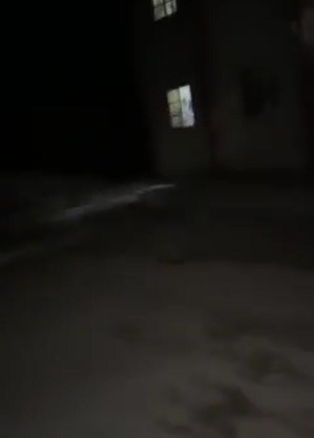 n outdoor area at night, adjacent to a building. The scene is dimly lit. Three people wearing light-colored shirts and shorts are walking away from the camera. There are windows on the building, one of which is illuminated. The ground appears to be a dark, uneven surface. There are a few scattered items on the ground, including what looks like some trash. The camera follows the three people as they walk away.