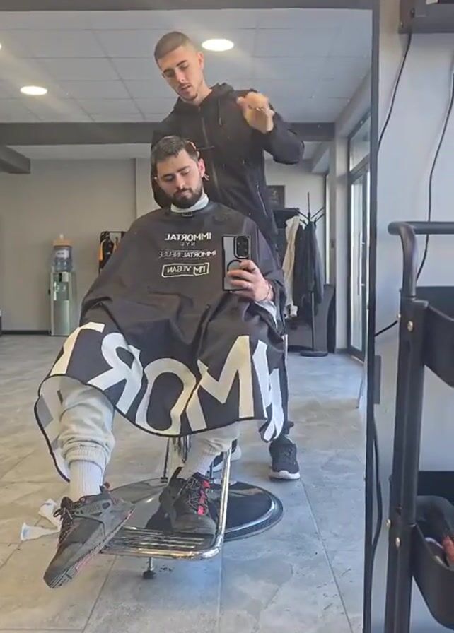 In a well-lit barbershop, a male barber with closely shaved hair, wearing a black jacket and pants, gives a haircut to a seated male customer. The customer, who has a beard, wears a black cape with large white lettering over light-colored sweatpants and black and red sneakers. He holds a smartphone, seemingly taking a photo. The barber uses scissors to trim the customer's hair. A large mirror reflects the scene, showing a water cooler and some clothing racks in the background. A barber's trolley is partially visible on the right side of the frame. The floor is tiled with a light-gray patterned design.