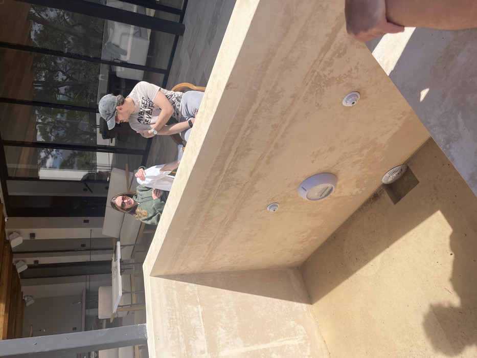 A low-angle shot depicts a man and a woman seated outdoors. The man, wearing a cap and t-shirt, sits with legs crossed. The woman, in sunglasses and a green jacket, holds a white object. The background includes a building with glass windows and white furniture. The foreground is the underside of a beige structure with embedded light fixtures and a vent. Shadowy areas are visible on the lower right.