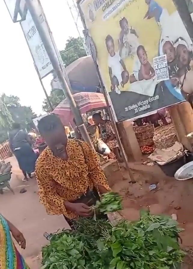woman in a yellow-patterned top standing behind a large container filled with leafy green vegetables at an outdoor market. She is sorting and picking through the greens. Behind her is a sign for "Infant Jesus Community Children's Home," featuring photos of children. There are other people and market stalls visible in the background, creating a busy street scene.