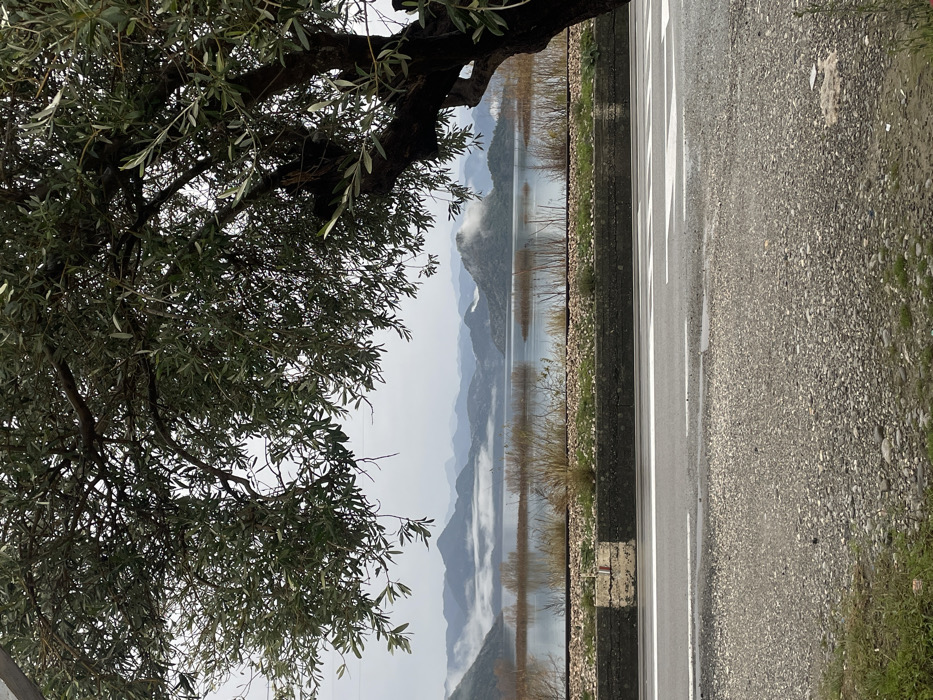The image presents an outdoor scene in Vranjina, Montenegro, featuring Skadar Lake under an overcast sky with widespread mist. In the immediate foreground, a gravelly ground surface with sparse green vegetation is visible. This transitions into a wet, dark asphalt road marked with a solid white line on the left and a broken white line on the right, indicative of a two-lane thoroughfare. A concrete barrier, approximately 0.5 meters high, separates the road from a narrow strip of land containing a set of railway tracks. The barrier is predominantly dark grey with a rectangular section of lighter, possibly worn, paint near its center. The railway tracks, showing signs of rust, run parallel to the road and the lake. Beyond the railway tracks, the expansive, calm waters of Skadar Lake dominate the midground. Numerous small, irregularly shaped islands or dense patches of reedy vegetation emerge from the lake's surface. Patches of low-lying mist or fog are visible on and above the water, partially obscuring the base of the distant landforms. The background consists of a chain of undulating mountains, some of their lower slopes and peaks partially shrouded in mist and low clouds. The sky is uniformly light grey and overcast. A prominent, mature olive tree with a thick, gnarled dark brown trunk and dense, silvery-green foliage occupies the right side and extends across the top of the frame, partially obscuring the upper view. No human figures, animals, or vehicles are discernible within the depicted environment.