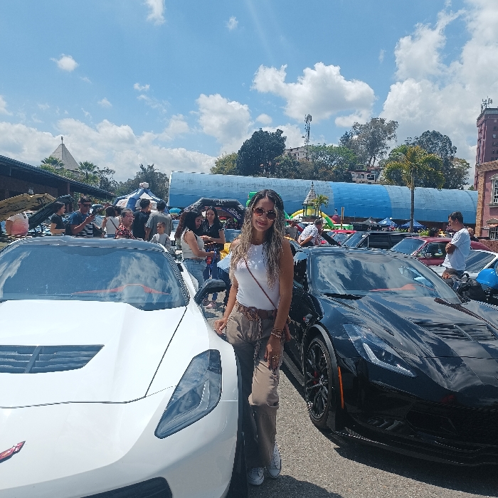 The image captures an outdoor car exhibition on a bright, partly cloudy day in Carrizal, Venezuela. A woman, positioned in the center-right foreground, faces the viewer with a slight smile. She has long, wavy light-colored hair, wears sunglasses, a white sleeveless top, light brown cargo pants, and white sneakers. Her left hand rests on the hood of a white Chevrolet Corvette, which occupies the left foreground, angled slightly towards the viewer. To her right, a black Chevrolet Corvette is parked, also facing the viewer, displaying red brake calipers on its front wheels. Both vehicles are situated on a paved surface. In the mid-ground and background, a crowd of individuals, including adults and some children, are observed interacting with or viewing numerous other vehicles, some with their hoods open. The background features several structures: a building with a dark roof and possibly a dome on the left, a large blue and white striped inflatable structure in the center, and a multi-story reddish-brown building with a prominent communications tower on the right. Green foliage and trees are visible throughout the distant background.
