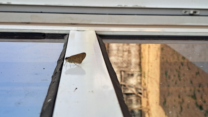 A light brown moth with closed wings is positioned on the interior, horizontal white frame of a window