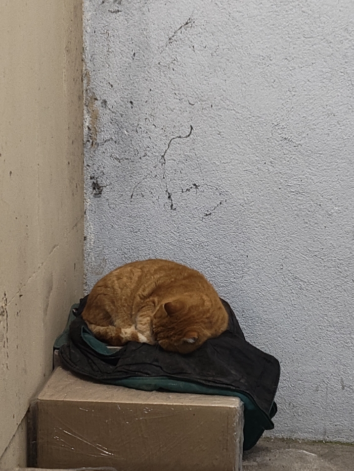 - "The scene, located in Burgas, Bulgaria, depicts a ginger cat sleeping curled tightly on a dark, possibly black or dark green, fabric item" by FM-8Zy5w1, licensed under CC BY 4.0