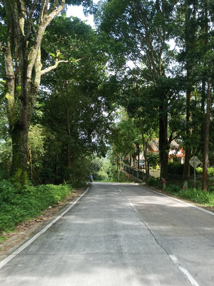A gray asphalt road stretches into the distance, framed by lush green trees. Sunlight filters through the canopy, creating dappled shadows on the pavement. Vegetation lines both sides of the road. A figure on a scooter is seen far ahead. A house with an orange roof and a bridge are visible on the right side of the road, partially obscured by trees. A road sign stands nearby.