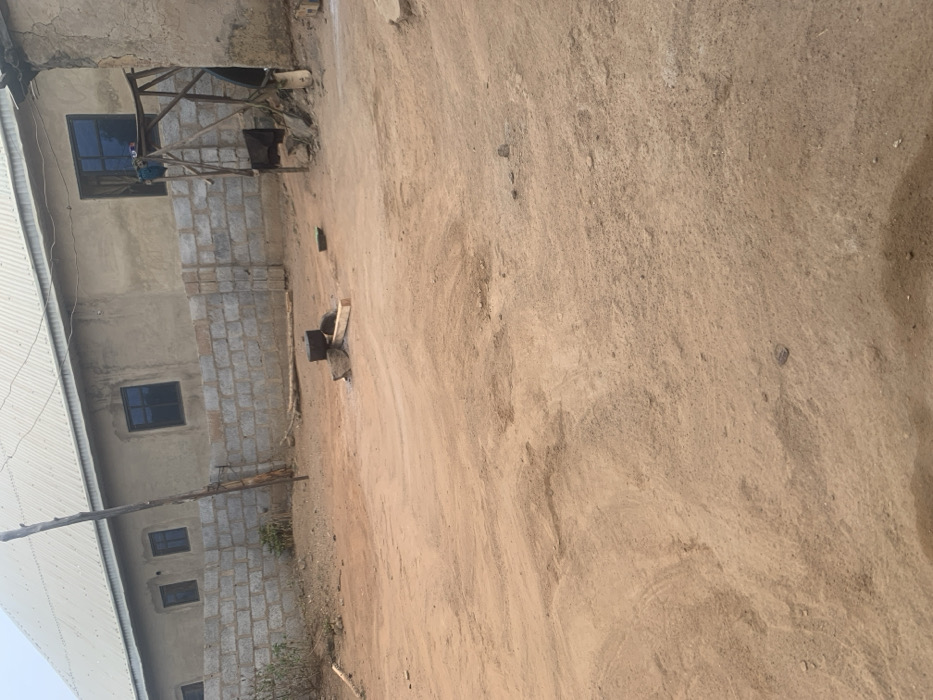 A building with a corrugated metal roof is visible on the left. The building's exterior features a mix of concrete and brickwork. Windows are evenly spaced along the side of the building. Adjacent to the building is a dirt area. Wooden structures are near the building.