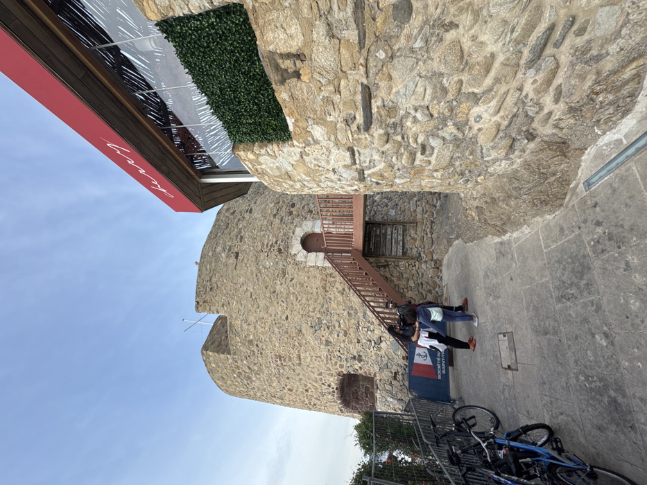 An outdoor scene in Saint-Tropez, France, depicts a historical stone tower adjacent to a modern building under a clear blue sky. On the left, a large, rounded stone tower constructed from varied rough-hewn blocks features a small arched wooden door about halfway up its height. A wooden staircase with railings ascends to this door from the stone-paved ground. Below the staircase, a stack of weathered wooden signs is visible. Further left and lower, a dark, arched recess is cut into the tower wall. In the foreground on the left, several bicycles are parked next to a metal barrier adorned with a blue banner displaying a white anchor and "SOCIETE NAUTIQUE SAINT-TROPEZ" in white text. Two individuals, an adult wearing dark clothing and red shoes, and a child in a light blue top and dark trousers with a light bag, stand on the paved ground near the base of the tower, appearing to interact. A flagpole with no flag is visible at the top of the tower. On the right, a multi-story structure is integrated into or built against a stone wall. Its upper section features a red awning bearing the white script "cherry." Below the awning are large glass windows, some partially obscured by a textured translucent film. Beneath the windows, a rectangular section of artificial green foliage is affixed to the stone facade. The lower part of this structure is also composed of rough-hewn stone. The ground is unevenly paved with grey stone, and a narrow linear light fixture is embedded into the paving on the far right foreground. The sky above is mostly clear with light blue hues.