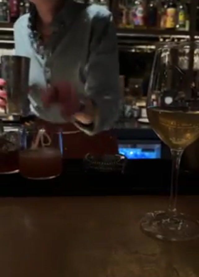A bartender in a blue shirt and brown apron works behind a bar. They hold a metal cocktail shaker and work on cocktails in two short glasses. Behind them is a shelf full of liquor bottles. In the foreground is a half-full wine glass on the bar.