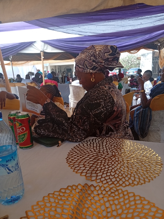A woman wearing a patterned head wrap and dark clothing sits at a table reading. Two cans of Hero beer and a water bottle are visible on the table, along with golden decorative placemats. Other people sit at tables in the background under a tent decorated with purple and gold fabric. The scene suggests an outdoor event or gathering.