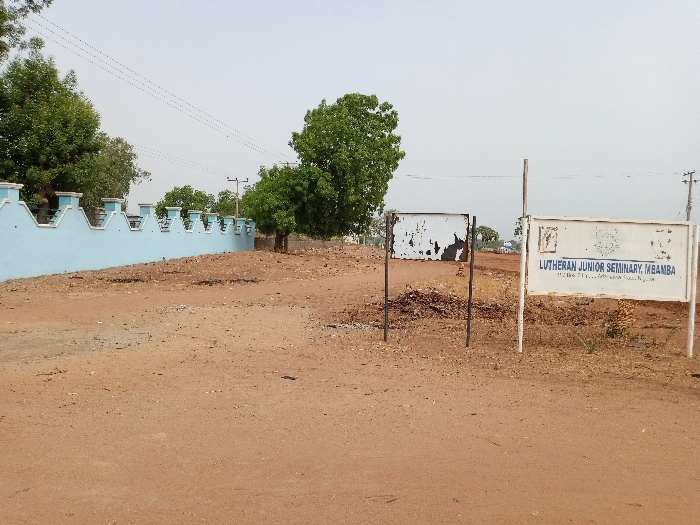 dirt road in front of a blue wall with white trim. There is a sign on the right side of the road that reads "LUTHERAN JUNIOR SEMINARY, IMBAMBA." There is a small tree to the left of the sign and another large tree further back on the left side of the image. The road leads to a clearing with a few trees in the distance. The image was taken in the city of Rumde Waziri, Nigeria, at the coordinates latitude: 9.188, longitude: 12.525.