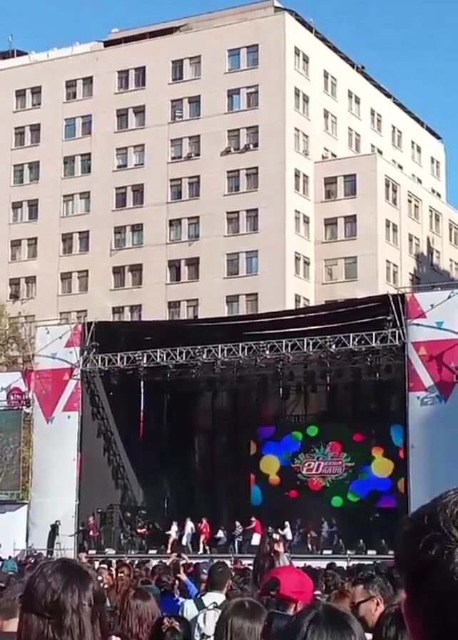 An outdoor concert featuring performers dancing on stage is captured from the perspective of someone in the audience. The stage features a large video screen displaying an animated design, framed by black curtains and scaffolding. The crowd, primarily viewed from the back, consists of numerous individuals of varying ages and hairstyles. In the background, a tall, rectangular building with multiple stories and numerous windows is visible against a clear blue sky. Banners frame the stage on either side. The overall setting suggests a public music event or festival held in an urban environment.