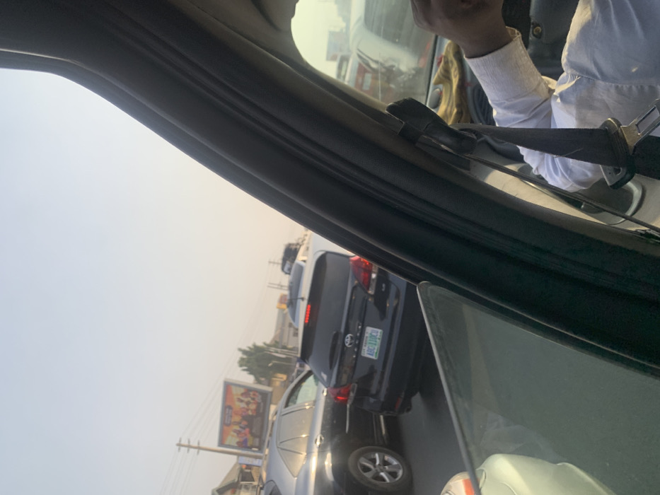 Captured from within a vehicle, the image shows a traffic jam. Several cars are visible, a black SUV with a green license plate is prominently positioned ahead. A billboard featuring people is also in view. The driver is wearing a white long-sleeved shirt, and the seatbelt is clearly visible. The sky appears hazy, possibly due to pollution.